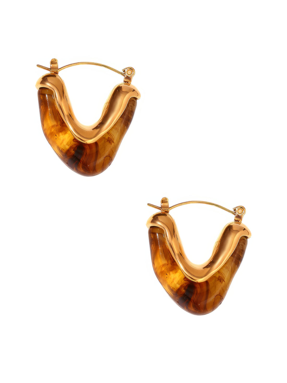 Sculptural curved hoop earrings featuring a blend of glossy 18K gold-plated stainless steel and translucent...